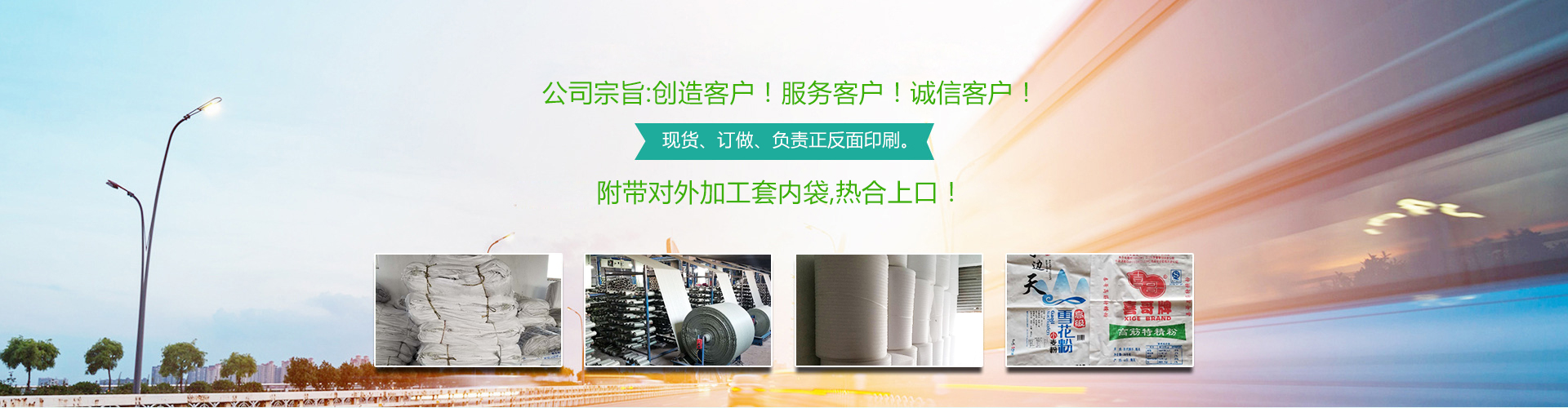 本公司常年生產(chǎn): 編織袋、彩膜、食品袋、集裝袋、飼料袋、化肥袋、水泥袋、化工袋、普危包裝袋、坯布專用內(nèi)袋、包皮、印染廠整裝專用包裝、有現(xiàn)貨、也訂做、負(fù)責(zé)正反面印刷。附帶對(duì)外加工套內(nèi)袋,熱合上口!聯(lián)系人:王經(jīng)理。 公司宗旨:創(chuàng)造客戶!服務(wù)客戶!誠(chéng)信客戶! 13256289338.17686389888